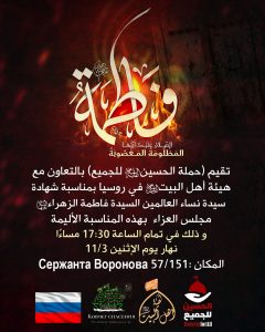 تزامنًا مع ذكرى استشهاد السيدة فاطمة الزهراء سلام الله عليها، أقام مجموعة من الطلاب الشيعة المقيمين في روسيا مراسم إحياء الأيام الفاطمية، وذلك بتعاون من حملة الإمام الحسين للجميع، وعددٍ من الهيئات والمراكز الدينية في روسيا، من أبرزها هيئة أهل البيت عليهم السلام وحسينية سفينة النجاة في مدينة فولغوغراد.